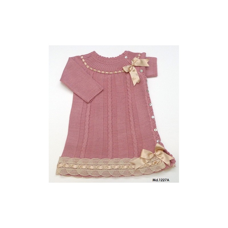 Vestido de punto en colores de bebé y tallas hasta 12 meses, puntillas y lazos combinando en crudo o blanco.