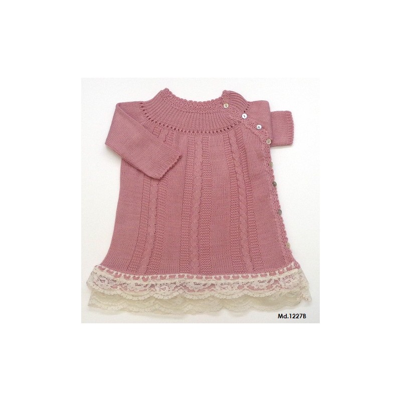 Vestido de punto en colores de bebé y tallas hasta 12 meses, puntillas y lazos combinando en crudo o blanco.