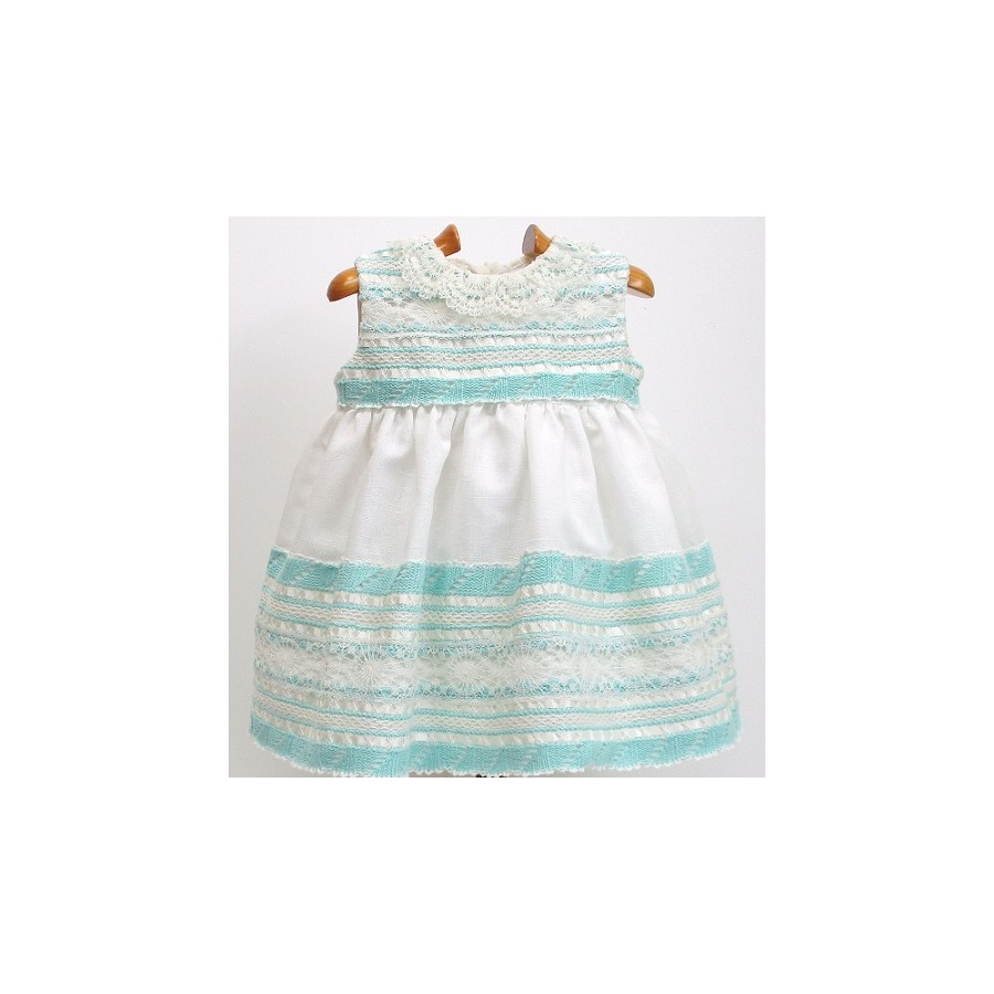 Vestido de manga sisa, de cuerpo de punto en varios colores pastel y la parte inferior de batista organdizada en colores blanco o crudo y con encajes de guipure del mismo color.