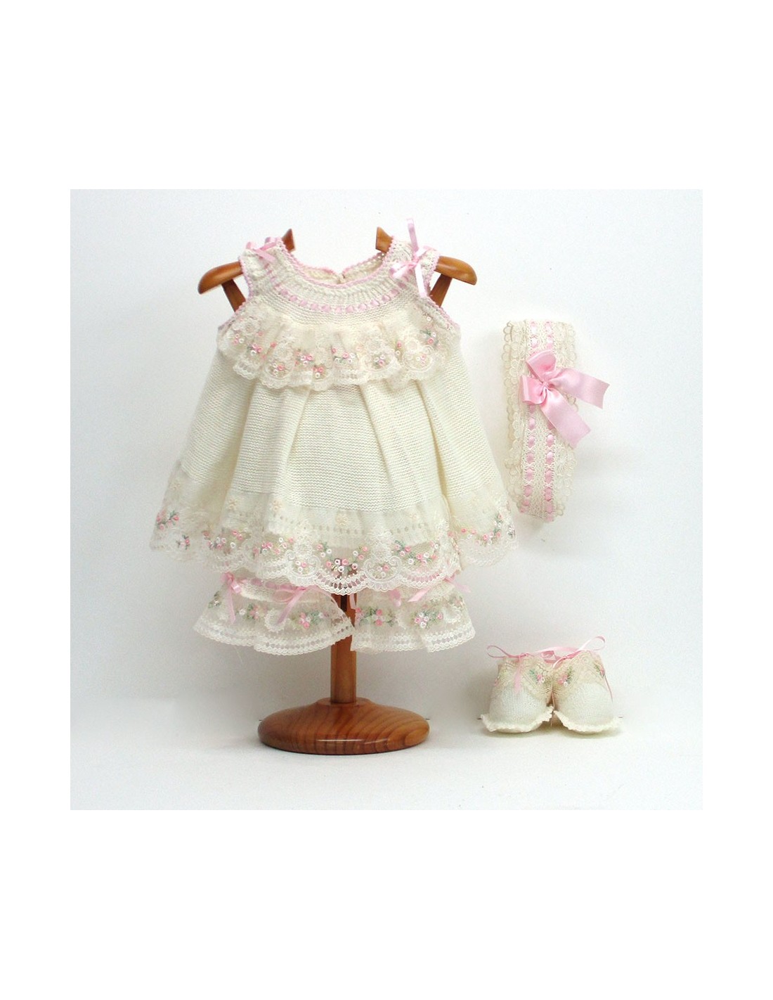 Conjunto de vestido de cuello redondo de tirantes, pololo, diadema y patucos, en colores crudo, rosa o celeste, con encajes de tul bordado en rosa o celeste.